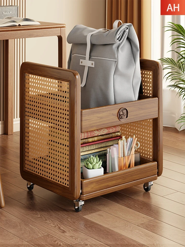 Wooden Rolling Book Storage Basket - Large Capacity Rattan Organizer for Kids' Books, Perfect for Under Desk Use, Ideal Bookshelf Solution for Children's Room
