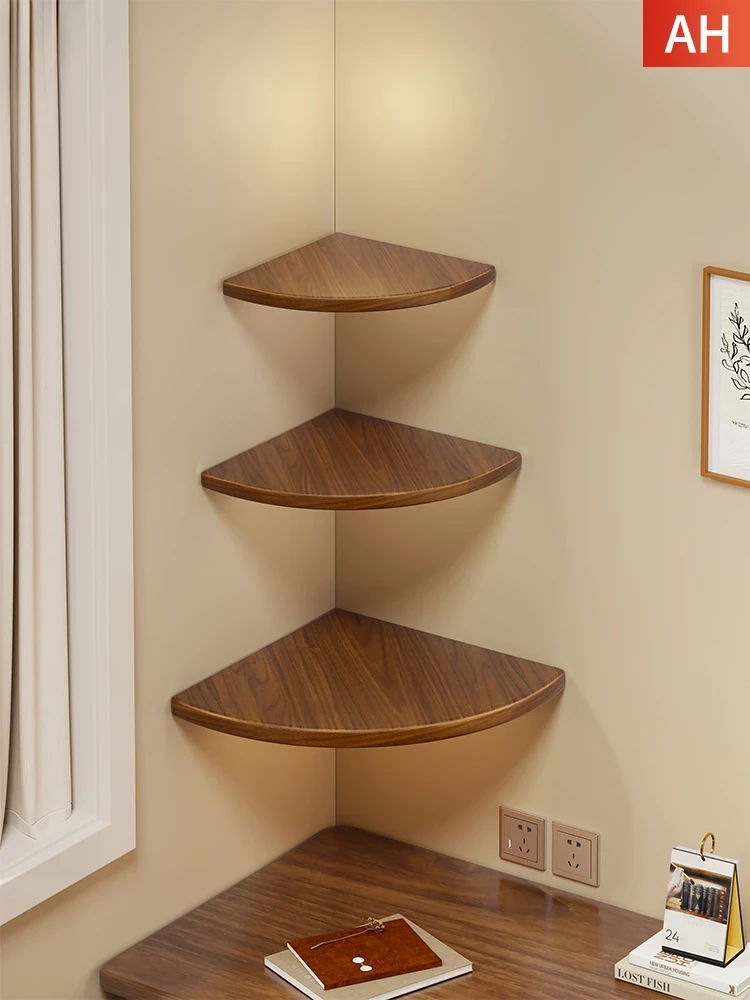 木製コーナーシェルフ - キッチンやリビングに最適!壁に穴を開けずに取り付けられる扇形デザインの収納棚。おしゃれな三角構造で、空間を有効活用し、スタイリッシュに整頓できます。